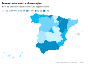 El problema en España —país declarado libre de “transmisión endémica” del virus por la OMS en 2017— está con la segunda dosis, admite la jefa de área de Programas de Vacunación del Ministerio de Sanidad, Aurora Limia. “España tiene en general unas coberturas elevadas y que se han mantenido bastante estables a lo largo de los años. Los porcentajes bajaron un poco con la pandemia, pero las comunidades han logrado luego que vuelvan a subir. La segunda dosis, sin embargo, queda casi todos los años algo por debajo del objetivo del 95%”, explica. En 2022, el porcentaje para toda España se quedó en el 93,7%, con cinco comunidades con niveles notablemente más bajos: Canarias y Extremadura (90,3% las dos), Castilla-La Mancha (88,8%), La Rioja (88,1%) y País Vasco (88%).