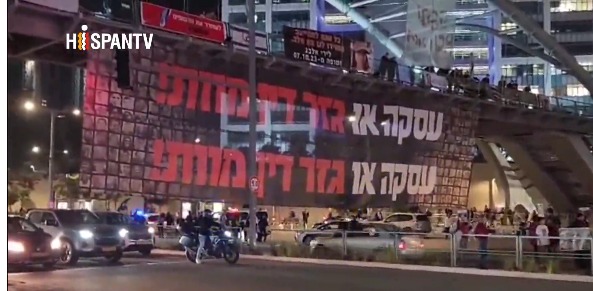 Los manifestantes han colgado una pancarta sobre un puente en Tel Aviv que pide “un acuerdo” de paz para traer de vuelta a los detenidos israelíes en la asediada Franja de Gaza.