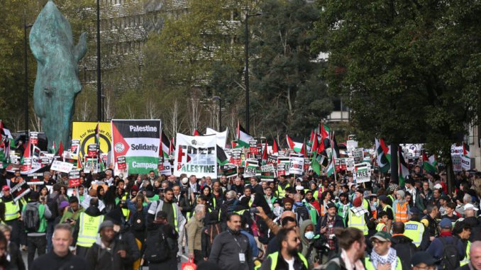 Según la Campaña de Solidaridad con Palestina, más de 2.000 manifestantes asistieron a la protesta, que exige al Gobierno británico un alto el fuego inmediato, al tiempo que condena a Israel por «cometer un genocidio en Gaza».