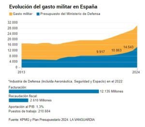 El Gobierno plasmó en el plan presupuestario de octubre que gastará el 1,3% del PIB en defensa durante este año. Son 52 millones al día y unos 400 euros por habitante. La militar es la única partida que crecerá en los presupuestos generales del 2024, por encima de la sanidad, la educación y la protección social. Serán unos 19.000 millones de euros. El presidente Sánchez confirmó en la cumbre de la OTAN de Madrid el compromiso de incrementar la inversión hasta alcanzar el 2% del PIB en el 2029. En el 2018, el año de la moción de censura, apenas se gastaba el 0,93%. Por establecer una comparación, la nómina mensual de las prestaciones contributivas de la Seguridad Social supone algo más de 12.100 millones. Según datos de la OTAN, los socios de la alianza invertirán en el 2024 un total de 380.000 millones de dólares en defensa, superando por primera vez el 2% del PIB en su conjunto. España, por tanto, aún está lejos.