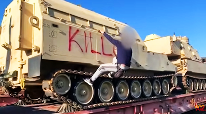Los manifestantes también escribían «Váyanse a casa asesinos» en un carro de combate.