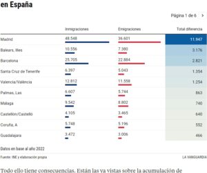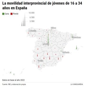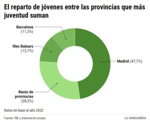 Los números, con todo, van más allá, porque según los últimos datos del Instituto Nacional de Estadística (INE) con el año 2022 por referencia, si sólo 18 de las 52 provincias españolas ganan jóvenes de entre 16 y 34 años (apenas un tercio) por movimientos interprovinciales, Madrid es la única que suma más de 11.000, lo que supone quedarse con la mitad del saldo positivo total.