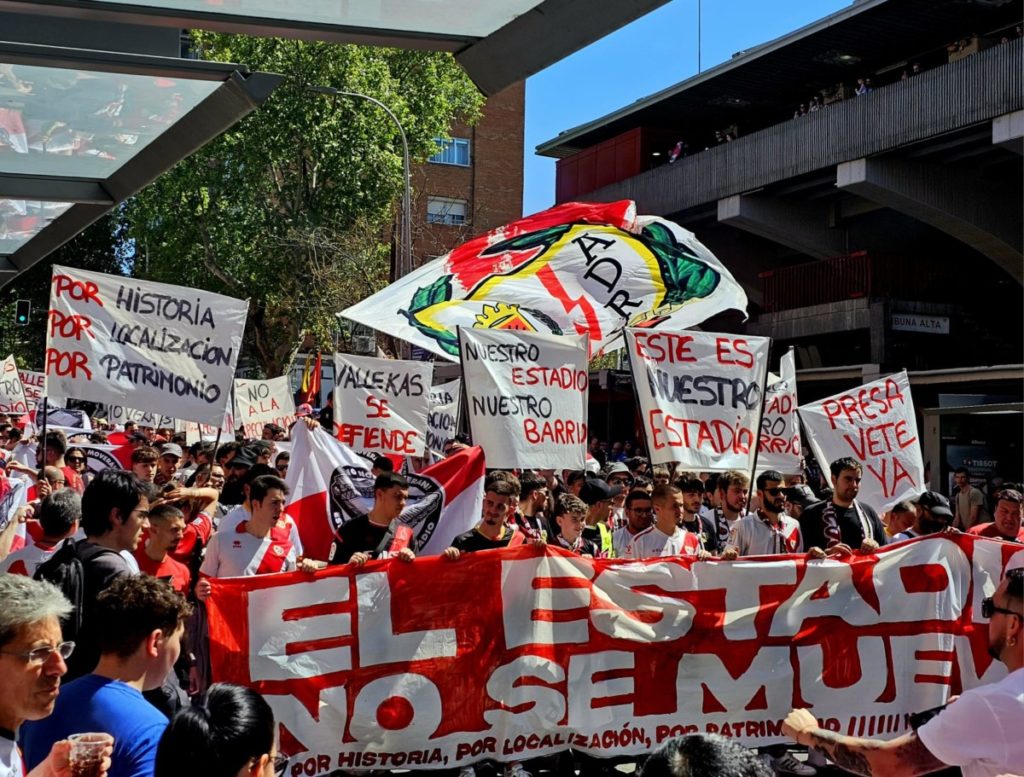 Como última acción de esta campaña en defensa del Estadio, se ha realizado una importante manifestación este sábado 13 de abril dónde miles de personas han recorrido las calles de Vallecas, desde Buenos Aires hasta la puerta del fondo del Estadio de Vallecas. Se ha dejado claro que tanto la afición como el resto del barrio, por arraigo, por historia y por defensa del patrimonio, no vamos a permitir que se traslade el Estadio, no solo del barrio, sino de su lugar actual, y menos habiendo detrás un pelotazo urbanístico que continúe con la gentrificación y la subida del precio de la vida en Vallecas.
