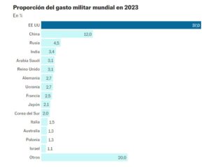 EE UU, con una importante influencia en Oriente Próximo, lleva años preparándose ante un conflicto en el que pueda verse arrastrado a actuar. Bajo el mandato del presidente, Joe Biden, Washington se mantuvo como el país con el mayor gasto militar en el mundo. En 2023, invirtió 859.000 millones de euros, acaparando un 37% de la cuota global, hasta tres veces más que China (12%), según los datos del instituto sueco. Su prioridad fue la categoría de “investigación, desarrollo, prueba y evaluación”, lo que demuestra que se aleja cada vez más de las operaciones contrainsurgentes y las guerras asimétricas para enfocarse en desarrollar nuevos sistemas de defensa y de ataque. Mientras tanto, China —en segundo lugar del ranking— aumentó la inversión por 29º año consecutivo. El ritmo, sin embargo, se ha desacelerado en los últimos años como consecuencia del frenazo de la economía.