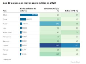 El tercer país que más invierte en el mundo es Rusia, que dedicó un 5,9% del PIB al gasto militar, el nivel más alto desde la disolución de la Unión Soviética. Aun así, el Sipri señala que, dada la opacidad de Moscú en cuanto a financiación militar, esta cifra puede ser mucho mayor. El incremento del gasto (24%) fue posible gracias a la fortaleza de la economía rusa, que pudo atajar las sanciones occidentales al petróleo y al gas y que se sostiene por su vasto fondo soberano. El FMI revisó la semana pasada su perspectiva de crecimiento para Rusia al 3,2% en 2024, por encima de EE UU (2,7%) o la zona euro (0,8%).