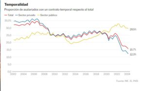 Asimismo, el ministerio subraya la caída en la temporalidad: la proporción de contratos temporales marca un mínimo en este siglo del 15,7%, en una nueva bajada que empezó con la reforma laboral. “Constituyen los mejores registros de la serie histórica”, defiende Economía. Antes de la aprobación de esta norma, que limita los escenarios en que las empresas pueden usar contratos temporales, el 25,6% eran de este tipo. Sin embargo, esta mejora no termina de trasladarse al sector público, donde estos contratos aún son un 29,5% del total, frente al 12,3% en la empresa privada, un mínimo histórico.