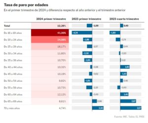 Por edades llama la atención la caída de la ocupación de 40 a 44 años, el grupo que más empleos pierde en términos absolutos tanto entre hombres (-33.800) como entre mujeres (-34.700). Estas personas retroceden en el mercado laboral incluso respecto al año pasado, el único grupo de edad que lo hace. Respecto a la tasa de paro, los que más mejoran en comparación con el pasado trimestre son los jóvenes, pese a que siguen notificando las cifras más altas: 41,06% de 16 a 19 años y 24,98% de 20 a 24.