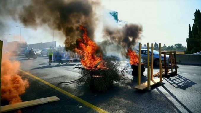 Los manifestantes indignados han bloqueado las importantes arterias en la capital como la Ruta 1 hacia Al-Quds (Jerusalén) o la autopista Ayalon, que atraviesa Tel Aviv, quemando neumáticos y extendiendo pancartas.