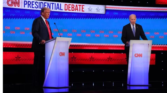 Trump respondió a una pregunta sobre su edad diciendo que le gustaría que Biden se sometiera a una prueba cognitiva y publicara los resultados, lo que provocó una risa del presidente.