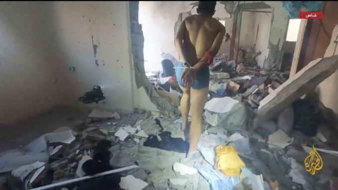 Muchos de estos prisioneros aparecen heridos, y varios de ellos están desnudos. En una escena, se puede ver claramente a un hombre golpeado y ensangrentado, con las manos atadas a la espalda, subiendo las escaleras de un edificio completamente destruido, buscando armas o más combatientes palestinos.