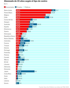 , ya que dicha proporción “raramente llega al 10% en otros sistemas educativos” desarrollados. El especialista en equidad educativa compara el dato español con el de otros Estados donde la enseñanza concertada también tiene una gran presencia, como Países Bajos, Corea del Sur o el Reino Unido, y en los que “las diferencias socioeconómicas entre escuelas ocurren exclusivamente dentro de cada una de las redes y, por lo tanto, la existencia de escuela concertada no contribuye a explicar la segregación escolar”. En el sistema español, en cambio, la abultada brecha socioeconómico entre las escuelas públicas y las concertadas “explica una parte significativa de la segregación escolar”.