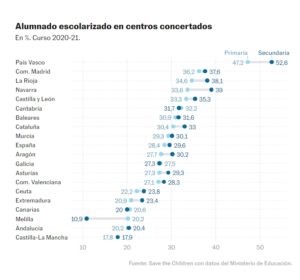 El informe de Save the Children, titulado Por una escuela concertada inclusiva, cuyo autor es Alfonso Echazarra —responsable del área educativa de la organización en España—, llega a la conclusión de que el factor principal que explica la segregación socioeconómica en España es el cobro de cuotas por parte de los centros concertados, que actúa como barrera de acceso para el alumnado de familias vulnerables. Y la ONG propone adoptar una serie de medidas, como una “financiación mejorada, gratuidad real y reglas de juego equitativas en los procesos de admisión” para que la concertada “pase de ser parte del problema a parte de la solución de la iniquidad equitativa”.
