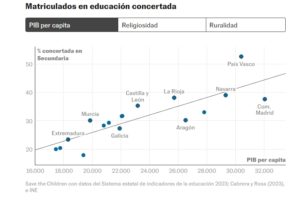 Sí parece haber cierta relación entre el hecho de que una región sea más rural y el peso de la concertada sea menor, aunque según el análisis de Save the Children esta es en todo caso “discreta”; solo explica un 18% de la varianza. Mucho menos que la riqueza, cuyo potencial explicativo resulta “extraordinario”, según Echazarra, con un grado de asociación del 69% ―el 100% supondría que están perfectamente asociadas y el 0%, que no hay relación―.