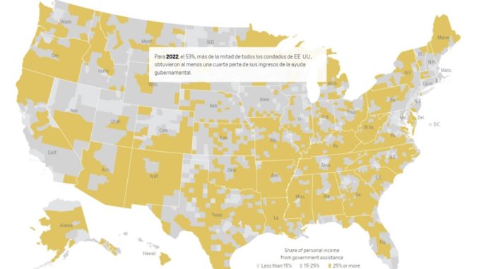Para 2022, el 53%, más de la mitad de todos los condados de EE. UU., obtuvieron al menos una cuarta parte de sus ingresos de la ayuda gubernamental.