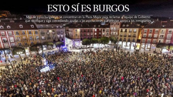 Burgos ha salido este miércoles a la calle para protestar contra la intención del equipo de Gobierno de dejar sin ayudas a las tres ONG que acogen a personas migrantes. La ciudadanía ha respondido al llamamiento del tejido social y empresarial local y ha abarrotado la Plaza Mayor para apoyar la labor de integración que realizan Burgos Acoge, Atalaya Intercultural y Accem, las organizaciones ‘vetadas’ por el Ayuntamiento por la imposición de Vox.