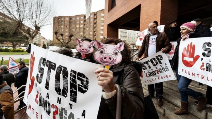 «Todos los días nos llegan noticias de pueblos en los que se presentan proyectos para montar macrogranjas. Acumulan años de tapadillo en los ayuntamientos y de repente salen a exposición pública en el Boletín Oficial de Castilla y León», asegura Aurora Vilariño, portavoz de la Asociación de Vecinos de Milagros. Junto a la de Fuentelcésped y a la Plataforma Stop Ganadería Industrial se manifestaron ayer a las puertas de la Delegación Territorial de la Junta de Castilla y León para exigir soluciones a este «problema medioambiental».
