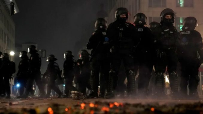 Según el portavoz de la policía de Berlín, Florian Nath, 330 personas fueron detenidas en la capital en Nochevieja. Un oficial de policía resultó gravemente herido después de ser “presumiblemente golpeado por un fuego artificial ilegal” y está siendo operado en el hospital, dijo Nath.
