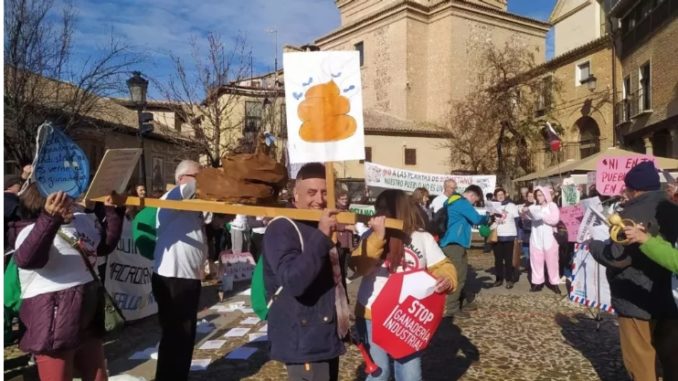Las inmediaciones del Palacio de Fuensalida, en Toledo, han sido hoy el escenario elegido por las plataformas ciudadanas contra las macrogranjas para arrancar el año con una manifestación de rechazo al fin de la moratoria que frenó la ampliación e instalación de más explotaciones porcinas desde 2022.