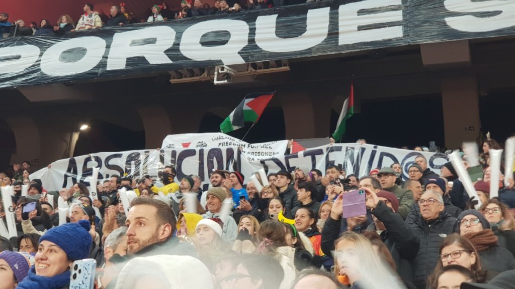 Decenas de activistas tanto de la Asamblea de Vallekas con Palestina, la Asamblea de apoyo a las personas encausadas por el Rodea el Congreso, Samidoun o Bukaneros se repartieron en las gradas superiores y este año por primera vez también en las inferiores, animando a los corredores y corredoras, desplegando pancartas exigiendo la absolución de las personas encausadas y la libertad de los presos y presas palestinas, y coreando cánticos.