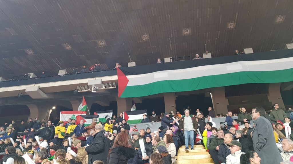 Los colectivos presentes en el estadio del Rayo Vallecano la tarde noche del 31 de diciembre coincidiendo con el final de la carrera de la San Silvestre centraron sus reivindicaciones en la muestra de solidaridad con la lucha del pueblo palestino así como con las personas encausadas por el Primer Rodea el Congreso convocado por la Coordinadora 25S, y con la celebración del Centenario del Rayo.