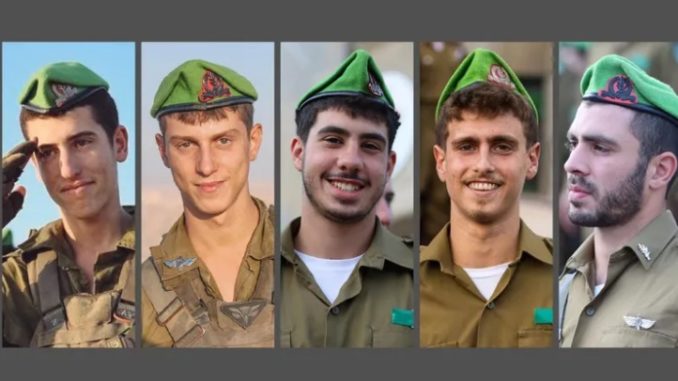 Cinco miembros de la unidad de reconocimiento de la Brigada Nahal murieron el lunes en Beit Hanoun, en el norte de la Franja de Gaza. Fueron identificados como el capitán Yair Yakov Shushan, de 23 años, de Ma’a lot-Tarshiha; el sargento Yahav Hadar, de 20 años, de Kfar Tavor; el sargento Guy Karmiel, de 20 años, de Gedera; el sargento Yoav Feffer, de 19 años, de Herzliya, y el sargento Aviel Yosef Wiseman, de 20 años, de Poriya Ilit.