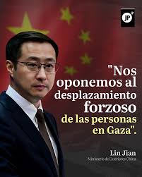 “El portavoz del Ministerio de Asuntos Exteriores de China, expresó la oposición de Pekín a la reubicación forzosa de los residentes de Gaza y al plan de Donald Trump para “apoderarse” del enclave palestino. China reiteró su apoyo a la creación de un Estado palestino soberano e independiente, basado en las fronteras de 1967 y con Jerusalén Oriental como capital.”