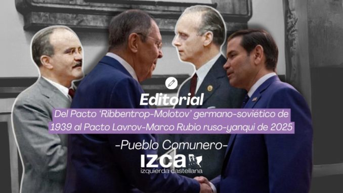 La historia no se repite nunca, pero es conveniente conocerla con una cierta profundidad para poder interpretarla y, a la luz de esa interpretación, que ha de ser rigurosa, comprender los acontecimientos de la actualidad. El tiempo que estamos viviendo es especialmente complejo y no se puede pretender que se produzcan réplicas del pasado de forma mecánica; eso sería un tremendo error teórico, del que se derivarían errores políticos en cadena. Pero el conocimiento medianamente profundo nos ha de servir para ayudar a iluminar algunos procesos y hechos de la actualidad, y si utilizamos esa metodología para interpretar el “pacto” entre Rusia y EEUU sobre la guerra en Ucrania, que ya veremos hasta dónde llega, el símil con más analogías que se nos ocurre es el pacto germanosoviético de 1939, o pacto “Ribbentrop-Molotov”. Cuando ese acuerdo se produjo, supuso un tremendo impacto mediático y en la opinión pública, especialmente en el mundo occidental, con opiniones que iban desde que la URSS había traicionado sus propios intereses y concepciones hasta similares valoraciones pero con respecto al proyecto nazi-alemán.
