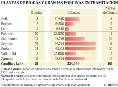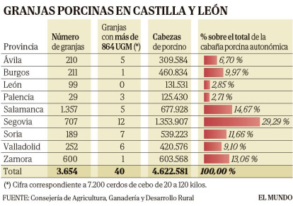 Si se tiene en cuenta la abundancia de granjas porcinas, Segovia se sitúa en cabeza con 16 explotaciones en tramitación y podrá incrementar su cabaña en 68.574 unidades. La última de la tabla es León, con solo dos granjas para 9.540 plazas. Se entiende como ‘plaza’ a la destinada a un cerdo de cebo estándar.
