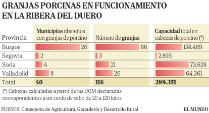 Esas granjas se distribuyen en 40 de los 102 términos municipales que comprende la DO Ribera del Duero, pertenecientes a cuatro provincias. Así, de los 60 pueblos que tiene Burgos en esa comarca, 26 tienen una o varias explotaciones, y suman 66 granjas porcinas, con una capacidad de 158.469 cabezas (traducidas las UGM a los referidos cerdos de cebo); Segovia, con 4 municipios en la DO, suma una capacidad de 2.893 cabezas, en las tres granjas instaladas en dos de sus pueblos; Soria, con 19 localidades en la comarca, suma 21 granjas distribuidas en 4 de ellas, con capacidad para 73.628 cabezas, y por último Valladolid, con 19 municipios ribereños, suma 26 granjas en 8 de ellos, para alojar 64.361 cabezas. Eso sí, esta provincia aloja las dos únicas que podrían considerarse ‘macrogranjas’, grandes explotaciones con capacidad para más de 7.200 cabezas, las dos en Pesquera de Duero.