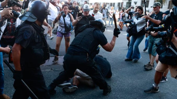 La protesta de los jubilados frente al Congreso terminó otra vez con la Policía Federal repartiendo gases y palos. Fue la tercera represión consecutiva: a las fuerzas de seguridad ya se les volvió una costumbre. A pesar del calor agobiante y del caos provocado por los cortes de luz en la ciudad de Buenos Aires, centenares de manifestantes acudieron a la convocatoria que cada miércoles (pagina12)