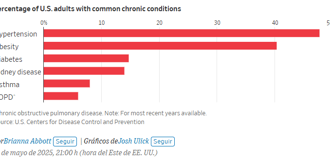 Las tasas de afecciones como la hipertensión y la enfermedad pulmonar obstructiva crónica se han mantenido relativamente estables en las últimas décadas, y la creciente prevalencia de la diabetes se debe en parte a que las personas viven más tiempo con esta enfermedad, según los investigadores. Sin embargo, Estados Unidos aún presenta tasas más altas de estas afecciones en comparación con países similares.