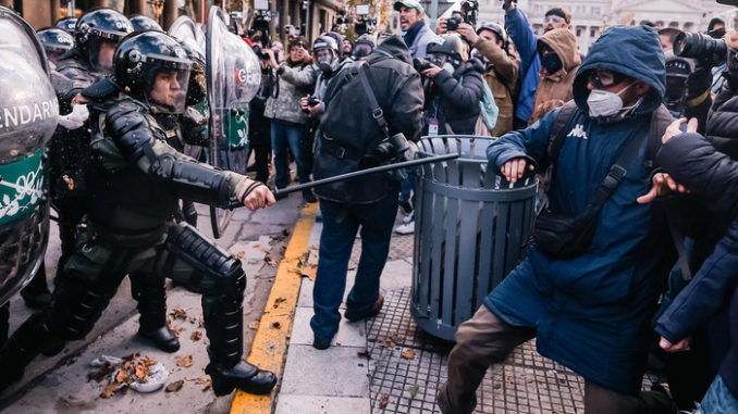 Las cuatro fuerzas de seguridad atacaron a los manifestantes que estaban en la vereda y en la plaza. Nuevamente, los trabajadores de prensa fueron agredidos.