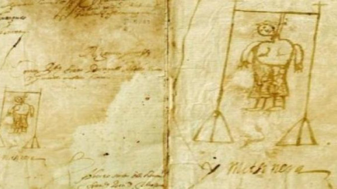 Este entrecomillado es ficticio. Francina Redorta, no. El 3 de octubre de 1616 la viuda de Miquel Redorta, de Menàrguens, en Lleida, fue condenada “per bruixa i metzinera” (bruja y envenenadora). La ahorcaron desnuda de cintura para arriba, como reflejó el escribano del proceso. Suyo es el único dibujo que tenemos de una bruja catalana, que se guarda en el archivo del monasterio de Poblet (documento 19, armario II, cajón 9).