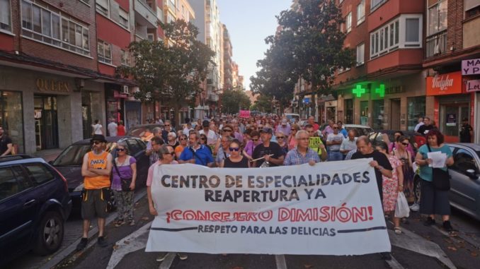 Más de un centenar de vecinos de Delicias [más de 200] –uno de los barrios más poblados de la capital, con más de 40.000 moradores– salieron ayer a la calle para plantarse ante esta situación. Encabezados por Susana Simón, portavoz de la Plataforma por la Sanidad Pública, se reunieron en el centro neurálgico del barrio, la plaza del Carmen, para después recorrer las calles y mostrar su rechazo a la decisión de la Junta de no reabrir el centro «a corto plazo».