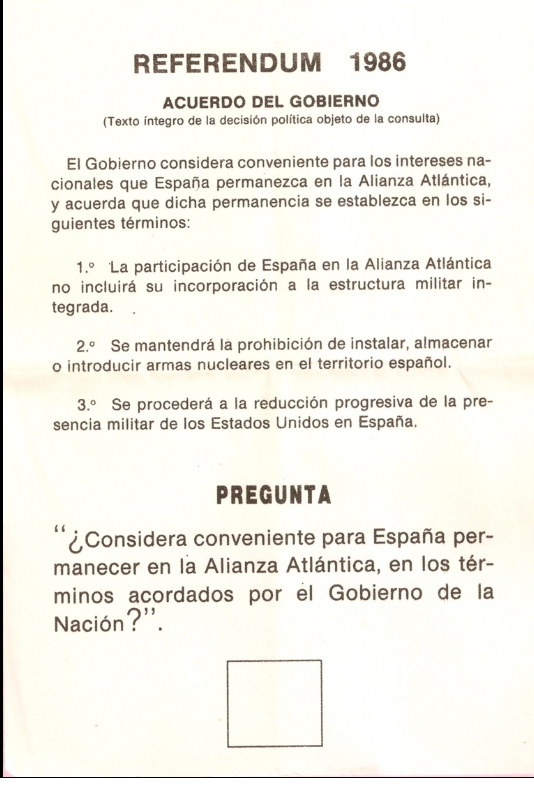 Empecemos por el lema de la precampaña encabezada por Felipe González en las elecciones generales de 1982: «OTAN, DE ENTRADA NO», que les fue de una gran utilidad, junto a otros factores, para la histórica victoria electoral del PSOE en las Generales de octubre de 1982. Para un sector de la población era bastante obvio que aquel lema respondía a un estudiado cálculo electoral y en absoluto a una auténtica voluntad anti-OTAN, tal como quedó demostrado en la campaña que hicieron alrededor del referéndum a favor de la permanencia en la Alianza Atlántica, en la que el felipismo y todos los poderes del Estado con los apoyos internacionales correspondientes jugaron a fondo para que el SÍ a la OTAN triunfara en la famosa consulta. Por cierto, las condiciones que teóricamente acompañaban a esa posición favorable a la permanencia no se cumplieron en medida alguna.