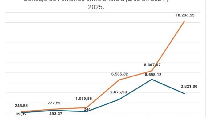 El gobierno de Sánchez-Díaz es un activo promotor del gasto militar. Durante el primer semestre de 2025 ha autorizado gasto militar, fuera del presupuestado en los presupuestos prorrogados de 2023, por más de 35.300 millones de euros, superando espectacularmente el que ya aprobó en 2024 y en 2023.