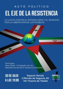 El acto político EL EJE DE LA RESISTENCIA PALESTINA. La lucha contra el imperialismo y el sionismo por la liberación de los pueblos, con la participación del embajador de Irán en Madrid y representantes de la resistencia palestina finalmente se realizará el Miércoles 30 de julio a las 19h. Espacio Ronda. Ronda de Segovia 50, Arganzuela .