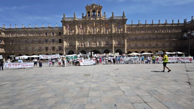 Decenas de vecinos de Villamayor, Babilafuente, Machacon y Tornadizos se concentraron el pasado domingo, 27 de julio, en la Plaza Mayor de Salamanca para manifestar su rechazo por la instalación de plantas de biogás, biometano e hidrógeno en las inmediaciones de sus municipios.