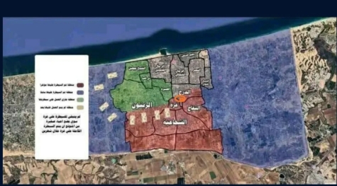 En el mapa difundido se señalan los principales barrios de la ciudad de Gaza y sus alrededores: Al-Zeitoun (الزيتون), Al-Shujaiya (الشجاعية), Al-Tuffah (التفاح), Al-Daraj (الدرج), Gaza centro (غزة), Al-Rimal Norte (الرمال الشمالي), Al-Rimal Sur (الرمال الجنوبي), Al-Sabra (الصبرة), Sheikh Radwan (الشيخ رضوان) y Al-Masira (المسيرة).
