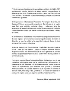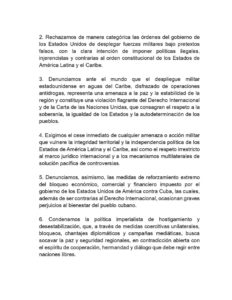 Asimismo, han condenado el bloqueo económico contra Cuba y reafirmado su compromiso con la paz, la soberanía, la igualdad y la consolidación de la América Latina y el Caribe como zona de paz libre de injerencia.