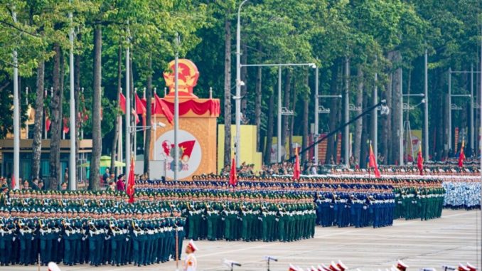 Posteriormente, marchan los bloques a pie, integrados por el Ejército Popular de Vietnam, ejércitos extranjeros invitados, milicias, guerrillas y unidades de la policía, en un orden preestablecido que refleja la diversidad y coordinación de las fuerzas de seguridad.