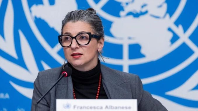 La relatora, de nacionalidad italiana, ha sido sancionada por Estados Unidos por su posición y, entre otras cosas, no puede viajar a Nueva York para presentar su informe a la Asamblea General de la ONU que se reunirá en esa ciudad próximamente, a menos que obtenga una exención de última hora.