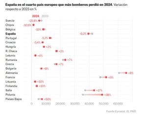 De vuelta a los datos oficiales, no es posible discernir si la caída de efectivos que recoge Eurostat se debe a servicios urbanos o forestales. Lo que sí está claro es que el bajón de 2024 fue el más abultado en términos absolutos de toda Europa, con 2.617 empleados menos. Esto se debe a que fue el país más poblado, y por tanto con mayores plantillas, entre los que vieron retroceder el número de trabajadores de extinción de fuegos. Le siguieron Suecia (1.587 bomberos menos), Bélgica (910 menos), Portugal (779), Croacia (436) y Chipre (159). En términos relativos, la caída de España fue la cuarta mayor, con un retroceso del 6,2%. La peor cifra es la de Suecia, con una bajada del 22,8%.